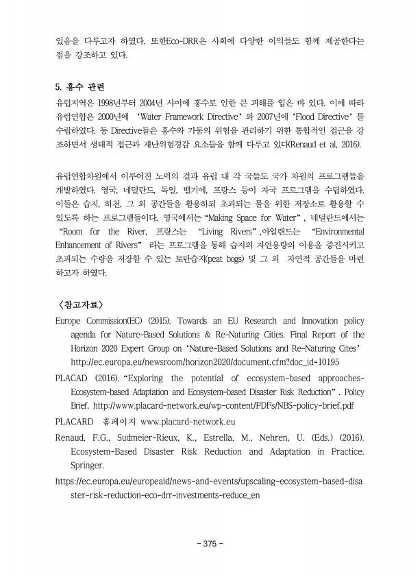 있음을 다루고자 하였다. 또한Eco-DRR은 사회에 다양한 이익들도 함께 제공한다는 점을 강조하고 있다. 5. 홍수 관련 유럽지역은 1998년부터 2004년 사이에 홍수로 인한 큰 피해를 입은 바 있다. 이에 따라 유럽연합은 2000년에 ‘Water Framework Directive’ 와 2007년에‘Flood Directive’ 를 수립하였다. 동 Directive들은 홍수와 가뭄의 위험을 관리하기 위한 통합적인 접근을 강 조하면서 생태적 접근과 재난위험경감 요소들을 함께 다루고 있다 Renaud et al, 2016 유럽연합차원에서 이루어진 노력의 결과 유럽 내 각 국들도 국가 차원의 프로그램들을 개발하였다. 영국, 네덜란드, 독일, 벨기에, 프랑스 등이 자국 프로그램을 수립하였다. 이들은 습지, 하천...
