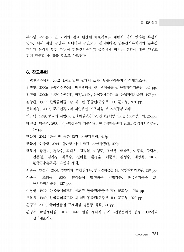 Ⅱ. 조사결과 www.nie.re.kr ? 381 두타연 코스는 구간 거리가 길고 민간에 제한적으로 개방이 되어 있다는 특성이 있다. 이에 해당 구간을 모니터링 구간으로 선정한다면 민통선이북지역의 곤충상 파악과 동시에 민간 개방이 민통선이북지역 곤충상에 미치는 영향에 대한 연구도 함께 진행할 수 있을 것으로 사료된다. 6. 참고문헌 국립환경과학원. 2012. DMZ 일원 생태계 조사 ?민통선이북지역 생태계조사-. 김진일. 2000a. 풍뎅이상과 상 , 딱정벌레목, 한국경제곤충 4. 농업과학기술원. 149 pp. 김진일. 2000b. 풍뎅이상과 하 , 딱정벌레목, 한국경제곤충 10. 농업과학기술원. 197 pp. 김창환. 1970. 한국동식물도감 제11권 동물편 곤충류 Ⅲ 문교부. 891 pp. 문화재청. 2...