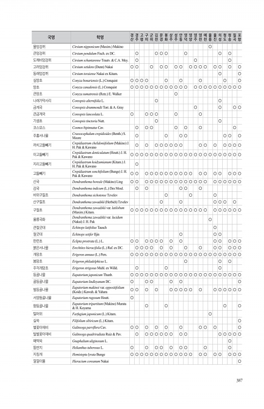 387 물엉겅퀴 Cirsium nipponicum Maxim. Makino ○ 큰엉겅퀴 Cirsium pendulum Fisch. ex DC. ○ ○ ○ ○ ○ ○ ○ 도깨비엉겅퀴 Cirsium schantarense Trautv. & C.A. Mey. ○ ○ ○ 고려엉겅퀴 Cirsium setidens Dunn Nakai ○ ○ ○ ○ ○ ○ ○ ○ ○ ○ ○ ○ ○ ○ ○ 동래엉겅퀴 Cirsium toraiense Nakai ex Kitam. ○ ○ 실망초 Conyza bonariensis L. Cronquist ○ ○ ○ ○ ○ ○ ○ ○ ○ 망초 Conyza canadensis L. Cronquist ○ ○ ○ ○ ○ ○ ○ ○ ○ ○ ○ ○ ○ ○ ○ ○ ○ ○ ○ ○ ○ ○ 큰망초 Conyza s...