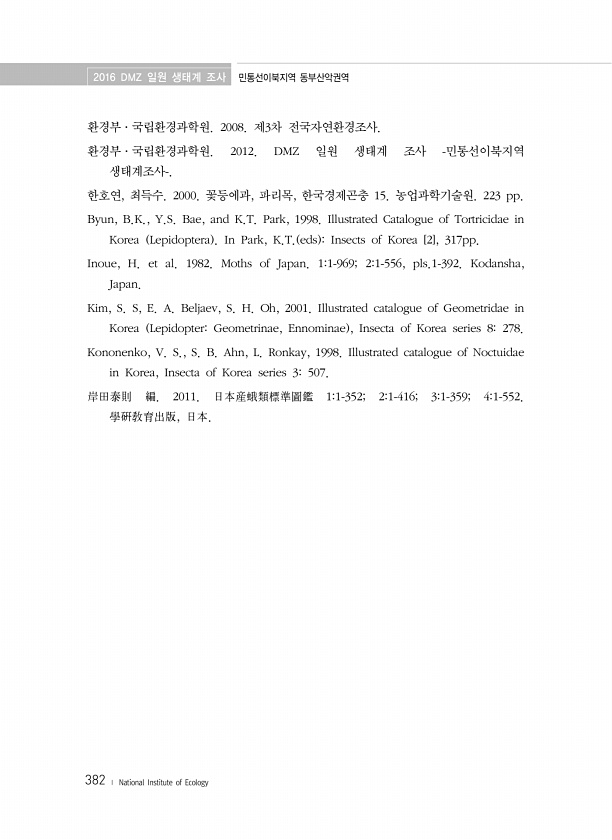2016 DMZ 일원 생태계 조사 민통선이북지역 동부산악권역 382 ? National Institute of Ecology 환경부·국립환경과학원. 2008. 제3차 전국자연환경조사. 환경부·국립환경과학원. 2012. DMZ 일원 생태계 조사 -민통선이북지역 생태계조사-. 한호연, 최득수. 2000. 꽃등에과, 파리목, 한국경제곤충 15. 농업과학기술원. 223 pp. Byun, B.K., Y.S. Bae, and K.T. Park, 1998. Illustrated Catalogue of Tortricidae in Korea Lepidoptera In Park, K.T. eds Insects of Korea [2], 317pp. Inoue, H. et al. 1982. Moths of Japan. 11-96...