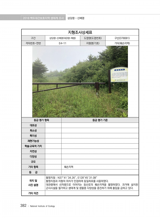 2018 백두대간보호지역 생태계 조사 삽당령 신배령 382 ? National Institute of Ecology 지형조사상세표 구간 삽당령신배령 대관령매봉 도엽명 도엽번호 구산 378081 격자번호-연번 E4-11 지형명 기호 기타 훼손지역 ㅔ 등급 평가 항목 등급 평가 기준 대표성 희소성 특이성 재현가능성 학술?교육적 가치 자연성 다양성 규모 기타 항목 훼손지역 등 급 위치 및 사진 설명 촬영지점 N37°41′34.26″, E128°45′31.08″ 촬영지점과 지형의 위치가 인접하여 동일좌표를 사용하였다. 대관령에서 선자령으로 이어지는 등산로의 훼손지역을 촬영하였다. 과거에 설치된 군사시설을 철거하고 생태계 및 생물종 다양성을 증진하기 위해 출입을 금하고 있다. 기타의견