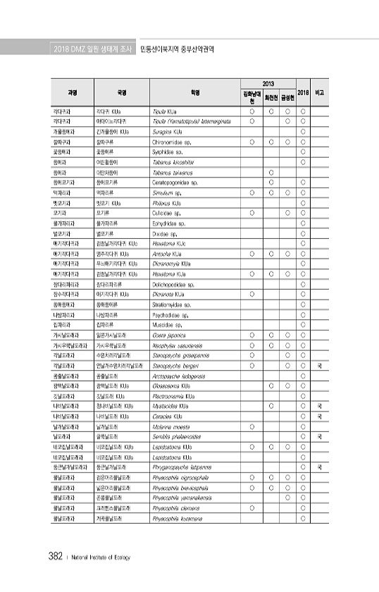 2018 DMZ 일원 생태계 조사 민통선이북지역 중부산악권역 382 ? National Institute of Ecology 과명 국명 학명 2013 김화남대 2018 비고 천 화천천 금성천 각다귀과 각다귀 KUa Tipula KUa ? ? ? ? 각다귀과 애아이노각다귀 Tipula Yamatotipula latemarginata ? ? ? 개울등에과 긴개울등에 KUa Suragina KUa ? 깔따구과 깔따구류 Chironomidae sp. ? ? ? ? 꽃등에과 꽃등에류 Syrphidae sp. ? 등에과 여린황등에 Tabanus kinoshitai ? 등에과 대만재등에 Tabanus taiwanus ? 등에모기과 등에모기류 Ceratopogonidae sp. ? ? 먹파리과 먹파리류 Simulium s...