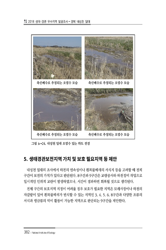 2018 생태·경관 우수지역 발굴조사 경북 내성천 일대 382 ? National Institute of Ecology 축산폐수로 추정되는 오염수 모습 축산폐수로 추정되는 오염수 모습 축산폐수로 추정되는 오염수 모습 축산폐수로 추정되는 오염수 모습 그림 ⅳ-24. 내성천 일대 오염수 있는 하도 전경 5. 내성천 일대의 조사에서 하천의 연속성이나 흰목물떼새의 서식지 등을 고려할 때 전체 구간이 보전의 가치가 있다고 판단된다. 8구간과 9구간은 교량공사와 하천정비 작업으로 일시적인 인위적 교란이 발생하였으나, 시간이 경과하면 회복될 것으로 생각된다. 전체 구간의 보호지역 지정이 어려울 경우 보호가 필요한 지역은 모래사장이나 하천의 자갈밭이 있어 흰목물떼새가 번식할 수 있는 지역인 3, 4, 5, 6, 8구간과 ...