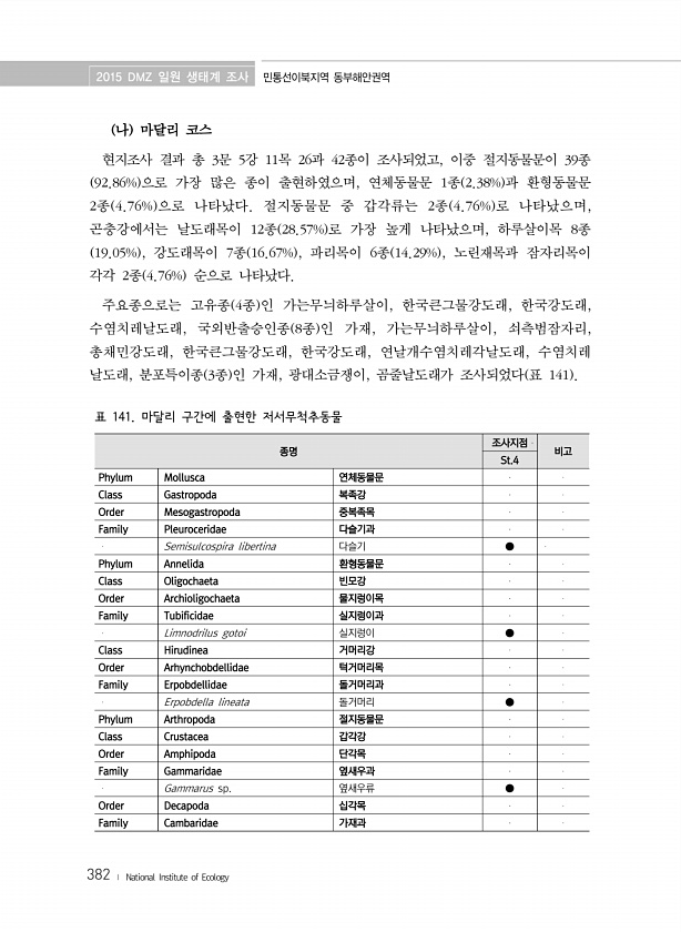 2015 DMZ 일원 생태계 조사 민통선이북지역 동부해안권역 382 ? National Institute of Ecology 종명 조사지점 비고 St.4 Phylum Mollusca 연체동물문 Class Gastropoda 복족강 Order Mesogastropoda 중복족목 Family Pleuroceridae 다슬기과 Semisulcospira libertina 다슬기 ● Phylum Annelida 환형동물문 Class Oligochaeta 빈모강 Order Archioligochaeta 물지렁이목 Family Tubificidae 실지렁이과 Limnodrilus gotoi 실지렁이 ● Class Hirudinea 거머리강 Order Arhynchobdellidae...