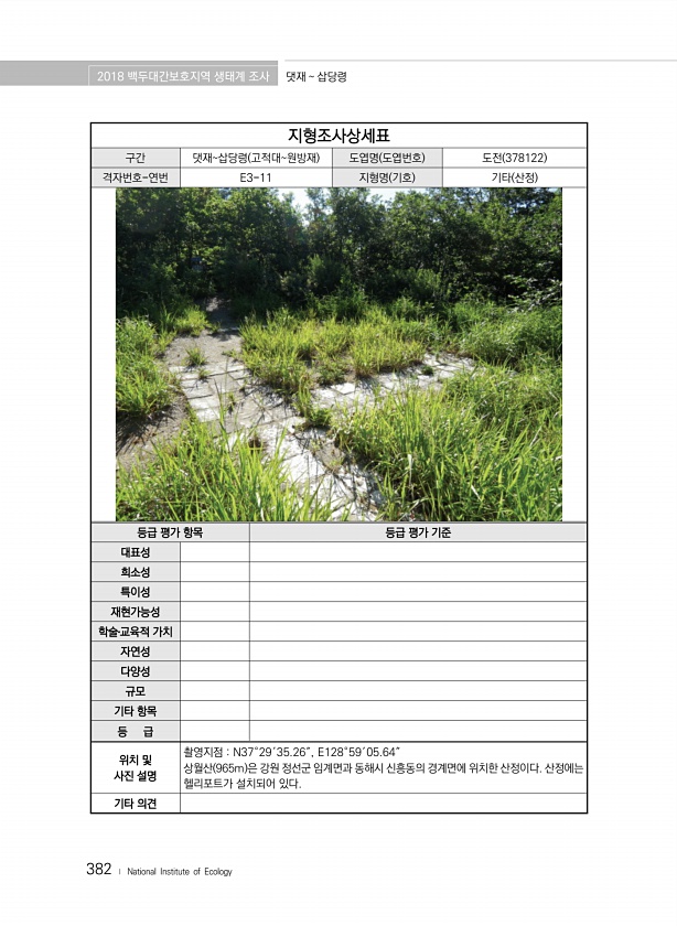 2018 백두대간보호지역 생태계 조사 댓재 삽당령 382 ? National Institute of Ecology 지형조사상세표 구간 댓재삽당령 고적대원방재 도엽명 도엽번호 도전 378122 격자번호-연번 E3-11 지형명 기호 기타 산정 등급 평가 항목 등급 평가 기준 대표성 희소성 특이성 재현가능성 학술?교육적 가치 자연성 다양성 규모 기타 항목 등 급 위치 및 사진 설명 촬영지점 N37°29′35.26″, E128°59′05.64″ 상월산 965m 은 강원 정선군 임계면과 동해시 신흥동의 경계면에 위치한 산정이다. 산정에는 헬리포트가 설치되어 있다. 기타의견