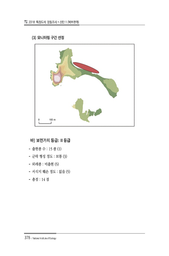 2018 특정도서 정밀조사 신안 1 북부권역 378 ? National Institute of Ecology 3 출현종 수 15 종 1 군락 형성 정도 보통 3 외래종 미출현 5 서식지 훼손 정도 없음 5 총점 14점