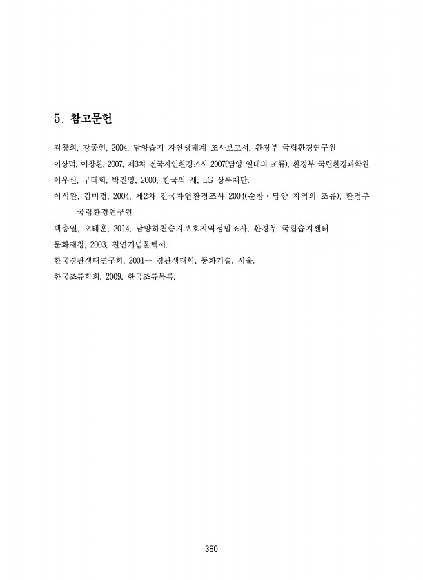 380 5. 참고문헌 김창회, 강종현, 2004, 담양습지 자연생태계 조사보고서, 환경부 국립환경연구원 이상덕, 이창환, 2007, 제3차 전국자연환경조사 2007 담양 일대의 조류 , 환경부 국립환경과학원 이우신, 구태회, 박진영, 2000, 한국의 새, LG 상록재단. 이시완, 김미경, 2004, 제2차 전국자연환경조사 2004 순창·담양 지역의 조류 , 환경부 국립환경연구원 백충열, 오태훈, 2014, 담양하천습지보호지역정밀조사, 환경부 국립습지센터 문화재청, 2003, 천연기념물백서. 한국경관생태연구회, 2001ㅡ 경관생태학, 동화기술, 서울. 한국조류학회, 2009,한국조류목록.