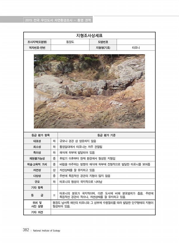 2015 전국 무인도서 자연환경조사 통영 권역 382 ? National Institute of Ecology 지형조사상세표 조사지역 도엽명 동장도 도엽번호 격자번호-연번 지형명 기호 타포니 등급 평가 항목 등급 평가 기준 대표성 하 규모나 경관 상 양호하지 않음 희소성 하 통영일대에서 타포니는 자주 관찰됨 특이성 하 해식애 하부에 발달되어 있음 재현불가능성 중 후빙기 이후부터 현재 환경에서 형성된 지형임 학술?교육적 가치 중 바람을 마주하는 방향의 해식애 하부에 전형적으로 발달한 타포니를 보여줌 자연성 상 자연상태를 잘 유지하고 있음 다양성 중 주변에 특징적인 경관의 지형이 많지 않음 규모 하 타포니의 형성이 국지적으로 나타남 기타 항목 등 급 Ⅱ 타포니의 분포가 국지적이며, 다른 도서에 비해 분포범위가 ...