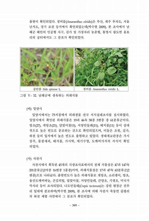 출현이 확인되었다. 청비름 Amaranthus viridis 은 부산, 제주 추자도, 서울 난지도, 경기 포천 등지에서 확인되었는데 박수현 2009 , 본 조사에서 남 해군 해안의 인공형 사구, 길가 및 가장자리 농촌형, 통영시 광도면 용호 리의 공터에서도 그 분포가 확인되었다. 공단풀 Sida spinosa L. 청비름 Amaranthus viridis L. 그림 Ⅴ- 32. 남해군에 생육하는 외래식물 바 밀양시 밀양시에서는 75지점에서 외래생물 전국 서식실태조사를 실시하였다. 밀양시에서 확인된 외래식물은 19과 46속 58종 3변종 총 61분류군이다. 망초 27 , 개망초 21 , 달맞이꽃13 , 서양민들레 11 , 돼지풀 11 등이 상대 적으로 높은 빈도로 분포하는 것으로 확인되었으며, 이들은 초원, ...