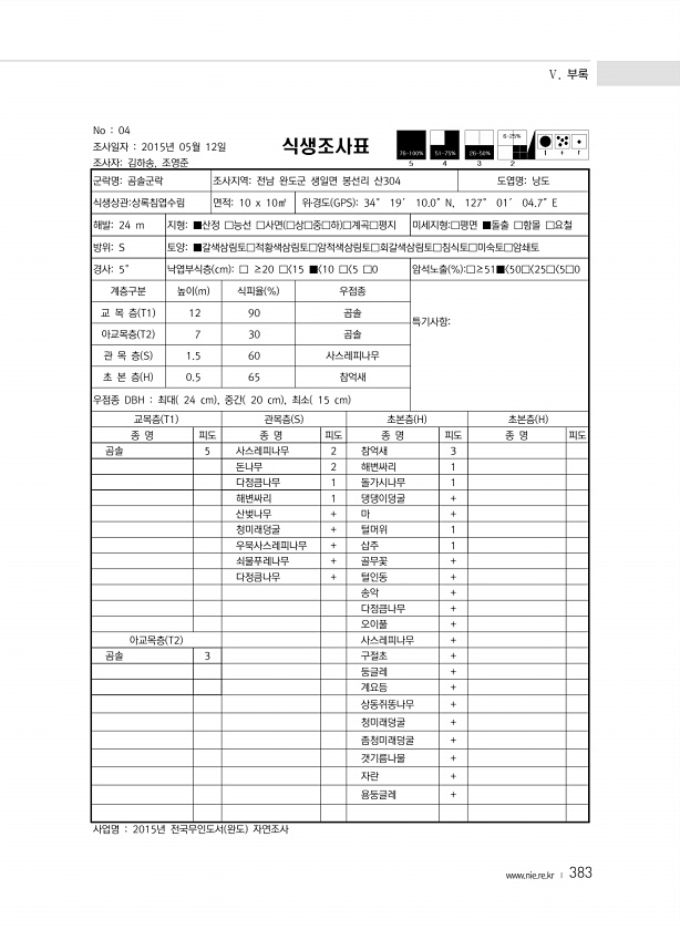 Ⅴ. 부록 www.nie.re.kr ? 383 No 04 조사일자 2015년 05월 12일 조사자김하송, 조영준 식생조사표 군락명곰솔군락 조사지역전남 완도군 생일면 봉선리 산304 도엽명낭도 식생상관상록침엽수림 면적10 x 10㎡ 위?경도 GPS 34° 19′ 10.0″N, 127° 01′ 04.7″E 해발24 m 지형■산정 □능선 □사면 □상□중□하 □계곡□평지 미세지형□평면 ■돌출 □함몰 □요철 방위S 토양■갈색삼림토□적황색삼림토□암적색삼림토□회갈색삼림토□침식토□미숙토□암쇄토 경사5° 낙엽부식층 cm □ ≥20 □ 15 ■ 10 □ 5 □0 암석노출 % □≥51■ 50□ 25□ 5□0 계층구분 높이 m 식피율 % 우점종 특기사항교 목 층 T1 12 90 곰솔 아교목층 T2 7 30 곰솔 관 목 층 S 1...