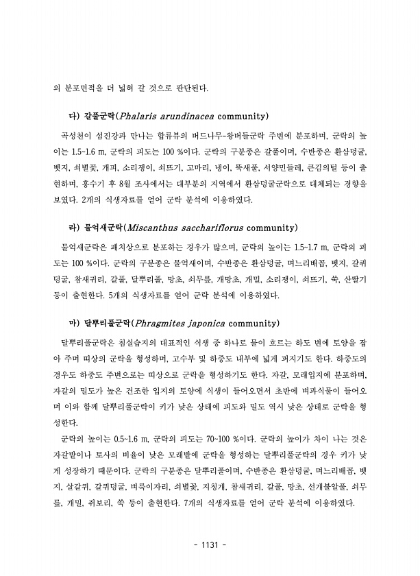 1131 의 분포면적을 더 넓혀 갈 것으로 판단된다. 다 갈풀군락 Phalaris arundinacea community 곡성천이 섬진강과 만나는 합류뷰의 버드나무-왕버들군락 주변에 분포하며, 군락의 높 이는 1.51.6 m, 군락의 피도는 100 %이다. 군락의 구분종은 갈풀이며, 수반종은 환삼덩굴, 벳지, 쇠별꽃, 개피, 소리쟁이, 쇠뜨기, 고마리, 냉이, 뚝새풀, 서양민들레, 큰김의털 등이 출 현하며, 홍수기 후 8월 조사에서는 대부분의 지역에서 환삼덩굴군락으로 대체되는 경향을 보였다. 2개의 식생자료를 얻어 군락 분석에 이용하였다. 라 물억새군락 Miscanthus sacchariflorus community 물억새군락은 패치상으로 분포하는 경우가 많으며, 군락의 높이는 1.51.7 m, 군락의 피 ...