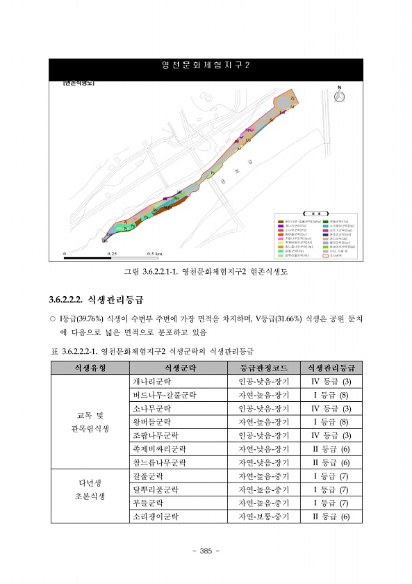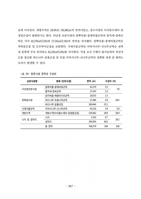 367 길게 이어진다 개방수역은 인 의 면적이었고 침수식생의 이삭물수세미 검 18.9% 145,062㎡ , 정말군집이 출현하기도 한다 다년생 초본식생의 달뿌리풀 콩제비꽃군락과 물억새 참쑥군 락은 각각 42,270 5.5% 17,543 2.3% ㎡ ㎡ 와 의 면적을 차지했다 달뿌리풀 콩제비꽃군락은 까락골군집 및 도루박이군집을 포함한다 식재식물군락인 아까시나무 신나무군락은 권역 내 동쪽에 주로 위치하고 45,216 5.9% ㎡ 를 차지한다 직접 조사 수행이 불가능하여 위성지 도를 참조한 버드나무 갈풀군집 및 인접 아까시나무 신나무군락의 정확한 경계 및 범위는 오차가 발생할 수 있다. 상관식생형 범례 단위식생 면적 ㎡ 구성비 % 다년생초본식생 달뿌리풀 콩제비꽃군락 42,270 5.5 7.8 물억새 참쑥군락- 17...