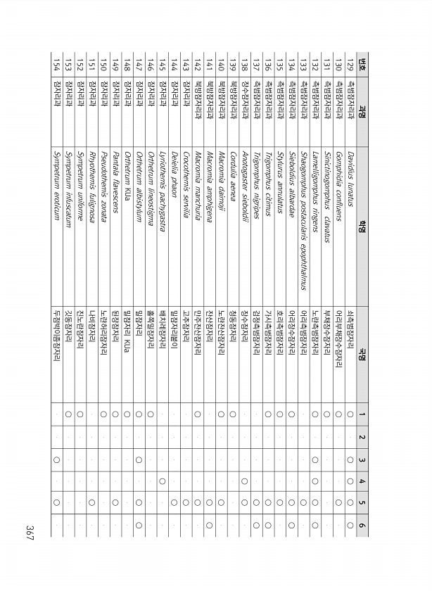 367 번호 과명 학명 국명 1 2 3 4 5 6 129 측범잠자리과 Davidius lunatus 쇠측범잠자리 ○ ○ ○ ○ ○ 130 측범잠자리과 Gomphidia confluens 어리부채장수잠자리 ○ ○ 131 측범잠자리과 Sinictinogomphus clavatus 부채장수잠자리 ○ 132 측범잠자리과 Lamelligomphus ringens 노란측범잠자리 ○ ○ ○ ○ ○ 133 측범잠자리과 Shaogomphus postacularis epophthalmus 어리측범잠자리 ○ 134 측범잠자리과 Sieboldius albardae 어리장수잠자리 ○ ○ ○ 135 측범잠자리과 Stylurus annulatus 호리측범잠자리 ○ ...