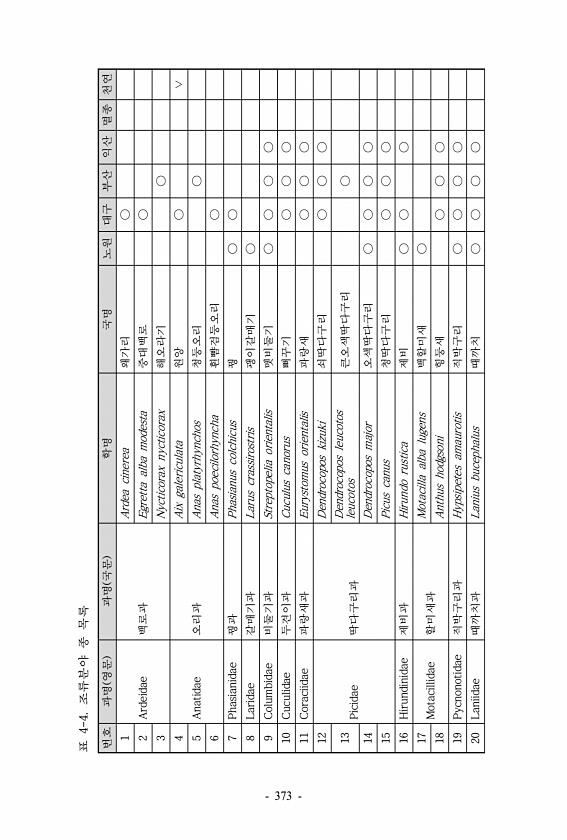번호 과명 영문 과명 국문 학명 국명 노원 대구 부산 익산 멸종 천연 1 Ardeidae 백로과 Ardea cinerea 왜가리 ○ 2 Egretta alba modesta 중대백로 ○ 3 Nycticorax nycticorax 해오라기 ○ 4 Anatidae 오리과 Aix galericulata 원앙 ○ ∨ 5 Anas platyrhynchos 청둥오리 ○ 6 Anas poecilorhyncha 흰뺨검둥오리 ○ 7 Phasianidae 꿩과 Phasianus colchicus 꿩 ○ ○ 8 Laridae 갈매기과 Larus crassirostris 괭이갈매기 ○ 9 Columbidae 비둘기과 Streptopelia orientalis 멧비둘기 ○ ○ ○ ○ 10 Cuculidae 두견이과 Cuculus ...