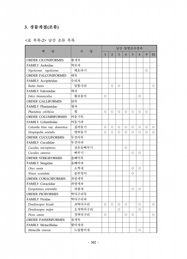 362 학 명 국 명 남산 월별조사결과 1 2 3 4 5 6 9 10 ORDER CICONIFORMES 황새목 FAMILY Ardeidae 백로과 Nycticorax nycticorax 해오라기 ○ ORDER FALCONIFORMES 매목 FAMILY Accipitridae 수리과 Buteo buteo 말똥가리 ○ ○ ○ FAMILY Falconidae 매과 Falco tinnunculus 황조롱이 ○ ○ ORDER GALLIFORMES 닭목 FAMILY Phasianidae 꿩과 Phasianus colchicus 꿩 ○ ○ ○ ○ ○ ○ ○ ORDER COLUMBIFORMES 비둘기목 FAMILY Columbidae 비둘기과 Columba livia var. domestica 집비둘기 ○ ○ ○ ○ ○ ...