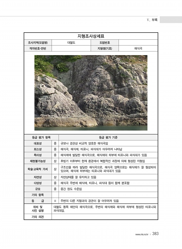 Ⅴ. 부록 www.nie.re.kr ? 383 지형조사상세표 조사지역 도엽명 대혈도 도엽번호 격자번호-연번 지형명 기호 해식곡 등급 평가 항목 등급 평가 기준 대표성 중 규모나 경관상 비교적 양호한 해식곡임 희소성 중 해식곡, 해식애, 타포니, 파식대가 어우려져 나타남 특이성 중 해식애에 발달한 해식곡으로, 해식애의 하부에 타포니와 파식대가 있음 재현불가능성 상 후빙기 이후부터 현재 환경에서 복합적인 과정에 의해 형성된 지형임 학술?교육적 가치 상 구조선을 따라 발달한 해식곡으로, 해식곡 양쪽으로는 해식애가 잘 형성되어 있으며, 해식애 하부에는 타포니와 파식대가 있음 자연성 상 자연상태를 잘 유지하고 있음 다양성 중 해식곡 주변에 해식애, 타포니, 파식대 등이 함께 분포함 규모 중 중간 정도 수준임 기타 항...