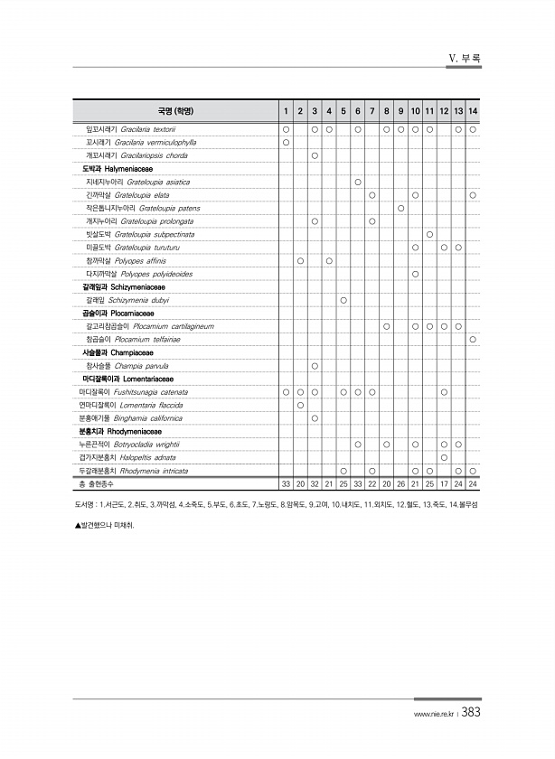 V. 부 록 www.nie.re.kr ?383 도서명 1.서근도, 2.취도, 3.까막섬, 4.소죽도, 5.부도, 6.초도, 7.노랑도, 8.암목도, 9.고여, 10.내치도, 11.외치도, 12.혈도, 13.죽도, 14.볼무섬 ▲발견했으나 미채취. 국명 학명 1 2 3 4 5 6 7 8 9 10 11 12 13 14 잎꼬시래기 Gracilaria textorii ○ ○ ○ ○ ○ ○ ○ ○ ○ ○ 꼬시래기 Gracilaria vermiculophylla ○ 개꼬시래기 Gracilariopsis chorda ○ 도박과 Halymeniaceae 지네지누아리 Grateloupia asiatica ○ 긴까막살 Grateloupia elata ○ ○ ○ 작은톱니지누아리 Grateloupia patens ○ 개지누아리 ...
