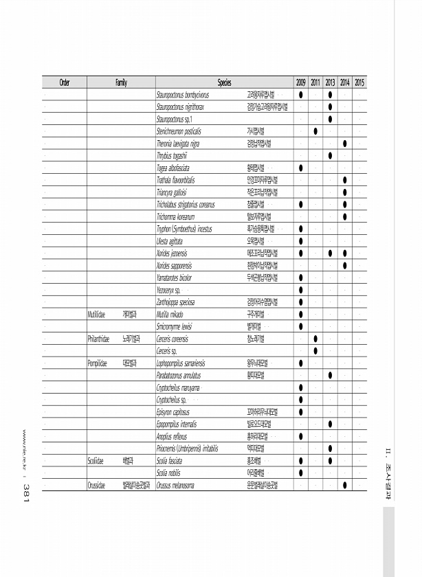 381 Order Family Species 2009 2011 2013 2014 2015 Stauropoctonus bombycivorus 고려왕자루맵시벌 ● ● Stauropoctonus nigrithorax 검정가슴고려왕자루맵시벌 ● Stauropoctonus sp.1 ● Stenichneumon posticalis 가시맵시벌 ● Theronia laevigata nigra 검정납작맵시벌 ● Thrybius togashii ● Togea albofasciata 황테맵시벌 ● Trathala flavoorbitalis 안경꼬마자루맵시벌 ● Triancyra galloisi 작은꼬리납작맵...