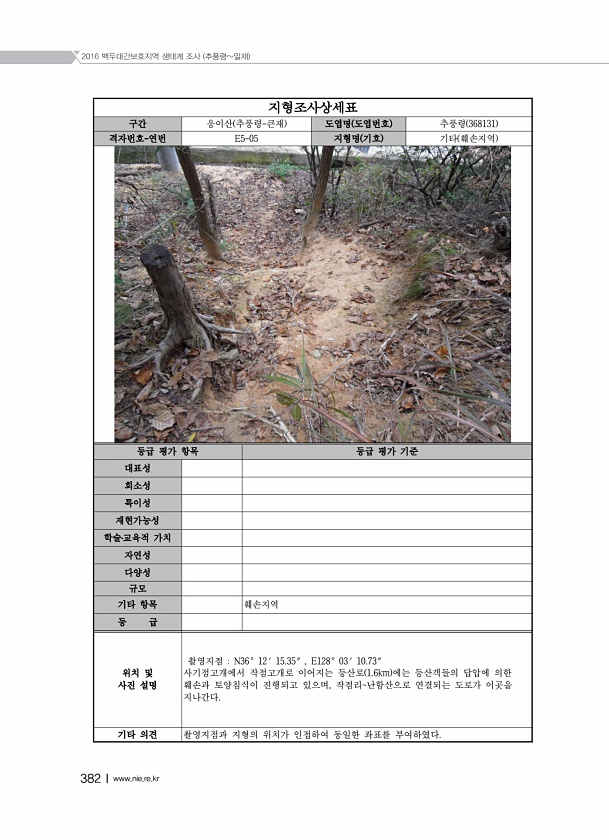 2016 백두대간보호지역 생태계 조사 추풍령밀재 382Ⅰwww.nie.re.kr 지형조사상세표 구간 웅이산 추풍령-큰재 도엽명 도엽번호 추풍령 368131 격자번호-연번 E5-05 지형명 기호 기타 훼손지역 등급 평가 항목 등급 평가 기준 대표성 희소성 특이성 재현가능성 학술?교육적 가치 자연성 다양성 규모 기타 항목 훼손지역 등 급 위치 및 사진 설명 촬영지점 N36° 12′ 15.35″ , E128° 03′ 10.73″ 사기점고개에서 작점고개로 이어지는 등산로 1.6km 에는 등산객들의 답압에 의한 훼손과 토양침식이 진행되고 있으며, 작점리난함산으로 연결되는 도로가 이곳을 지나간다. 기타 의견 촬영지점과 지형의 위치가 인접하여 동일한 좌표를부여하였다.