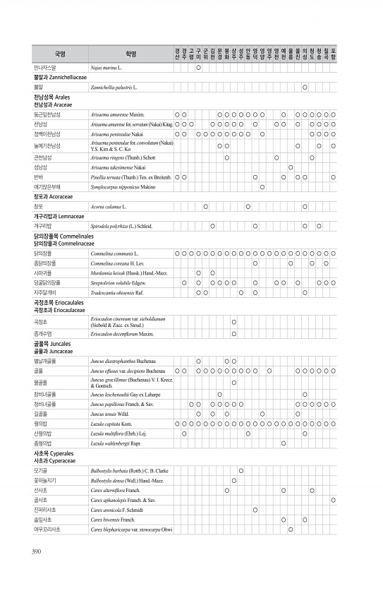 390 민나자스말 Najas marina L. ○ 뿔말과 Zannichelliaceae 뿔말 Zannichellia palustris L. ○ 천남성목 Arales 천남성과 Araceae 둥근잎천남성 Arisaema amurense Maxim. ○ ○ ○ ○ ○ ○ ○ ○ ○ ○ ○ ○ ○ ○ ○ ○ 천남성 Arisaema amurense for. serratum Nakai Kitag. ○ ○ ○ ○ ○ ○ ○ ○ ○ ○ ○ ○ ○ ○ ○ ○ 점백이천남성 Arisaema peninsulae Nakai ○ ○ ○ ○ ○ ○ ○ ○ ○ ○ ○ ○ ○ ○ ○ 눌메기천남성 Arisaema peninsulae for. convolutum Nakai Y.S. Kim & S. C. Ko ○ ○ ○ ○ ○ 큰천남성 Ari...