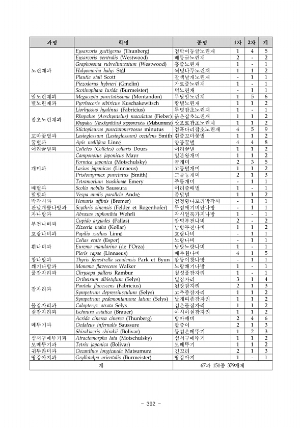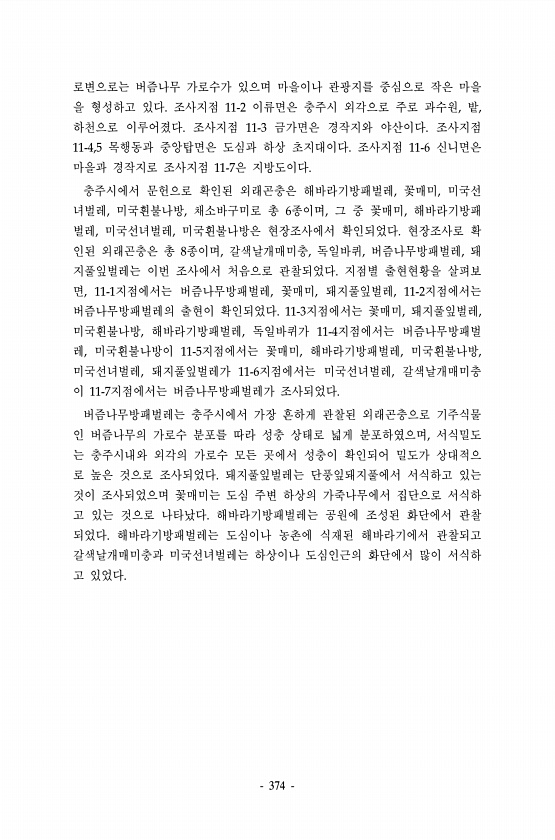 374 로변으로는 버즘나무 가로수가 있으며 마을이나 관광지를 중심으로 작은 마을 을 형성하고 있다. 조사지점 11-2 이류면은 충주시 외각으로 주로 과수원, 밭, 하천으로 이루어졌다. 조사지점 11-3 금가면은 경작지와 야산이다. 조사지점 11-4,5 목행동과 중앙탑면은 도심과 하상 초지대이다. 조사지점 11-6 신니면은 마을과 경작지로 조사지점 11-7은 지방도이다. 충주시에서 문헌으로 확인된 외래곤충은 해바라기방패벌레, 꽃매미, 미국선 녀벌레, 미국흰불나방, 채소바구미로 총 6종이며, 그 중 꽃매미, 해바라기방패 벌레, 미국선녀벌레, 미국흰불나방은 현장조사에서 확인되었다. 현장조사로 확 인된 외래곤충은 총 8종이며, 갈색날개매미충, 독일바퀴, 버즘나무방패벌레, 돼 지풀잎벌레는 이번 조사에서 처음으로 관찰...