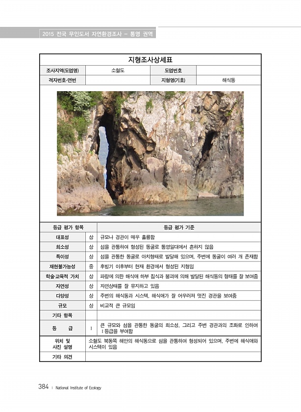 2015 전국 무인도서 자연환경조사 통영 권역 384 ? National Institute of Ecology 지형조사상세표 조사지역 도엽명 소혈도 도엽번호 격자번호-연번 지형명 기호 해식동 등급 평가 항목 등급 평가 기준 대표성 상 규모나 경관이 매우 훌륭함 희소성 상 섬을 관통하여 형성된 동굴로 통영일대에서 흔하지 않음 특이성 상 섬을 관통한 동굴로 아치형태로 발달해 있으며, 주변에 동굴이 여러 개 존재함 재현불가능성 중 후빙기 이후부터 현재 환경에서 형성된 지형임 학술?교육적 가치 상 파랑에 의한 해식애 하부 침식과 붕괴에 의해 발달된 해식동의 형태를 잘 보여줌 자연성 상 자연상태를 잘 유지하고 있음 다양성 상 주변의 해식동과 시스텍, 해식애가 잘 어우러져 멋진 경관을 보여줌 규모 상 비교적 큰 규모임...