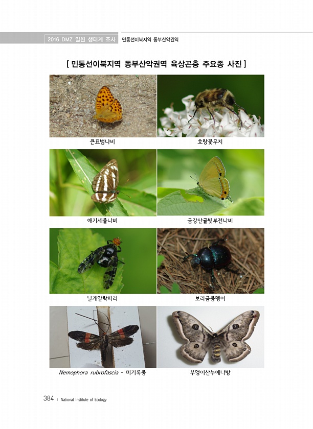 2016 DMZ 일원 생태계 조사 민통선이북지역 동부산악권역 384 ? National Institute of Ecology [ 민통선이북지역 동부산악권역 육상곤충 주요종 사진 ] 큰표범나비 호랑꽃무지 애기세줄나비 금강산귤빛부전나비 날개알락파리 보라금풍뎅이 Nemophora rubrofascia 미기록종부엉이산누에나방