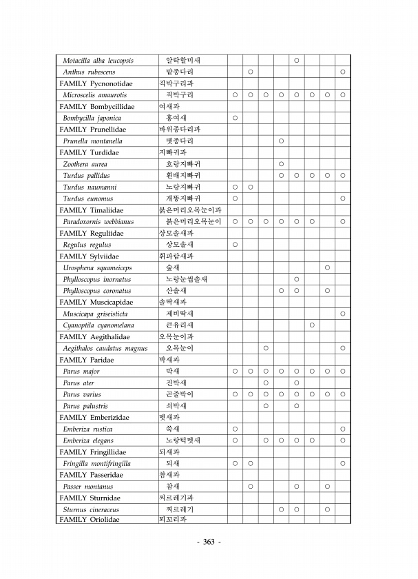363 Motacilla alba leucopsis 알락할미새 ○ Anthus rubescens 밭종다리 ○ ○ FAMILY Pycnonotidae 직박구리과 Microscelis amaurotis 직박구리 ○ ○ ○ ○ ○ ○ ○ ○ FAMILY Bombycillidae 여새과 Bombycilla japonica 홍여새 ○ FAMILY Prunellidae 바위종다리과 Prunella montanella 멧종다리 ○ FAMILY Turdidae 지빠귀과 Zoothera aurea 호랑지빠귀 ○ Turdus pallidus 흰배지빠귀 ○ ○ ○ ○ ○ Turdus naumanni 노랑지빠귀 ○ ○ Turdus eunomus 개똥지빠귀 ○ ○ FAMILY Timaliidae 붉은머리오목눈이과 Paradoxor...