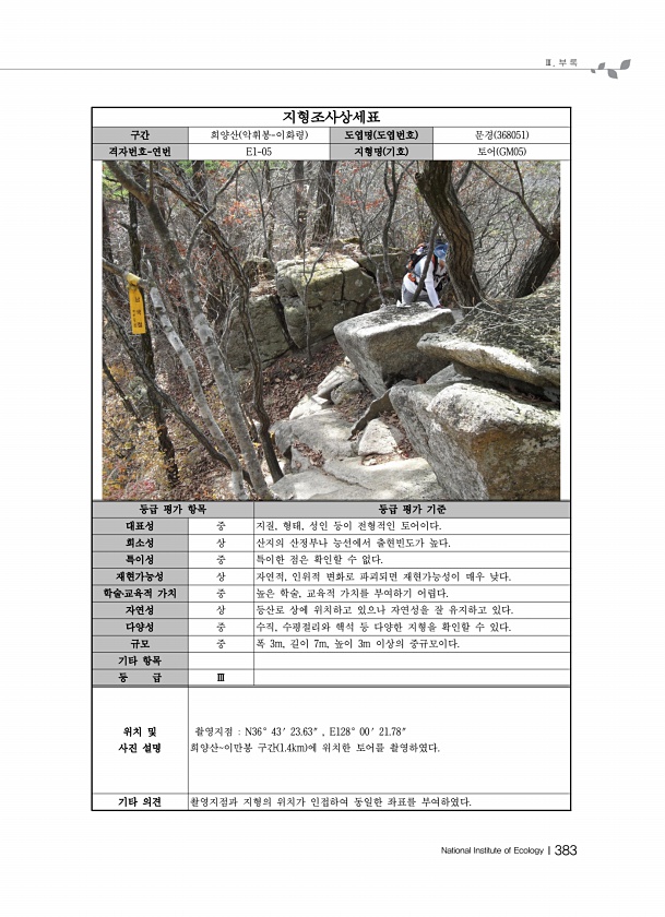 Ⅲ. 부 록 National Institute of EcologyⅠ383 지형조사상세표 구간 희양산 악휘봉-이화령 도엽명 도엽번호 문경 368051 격자번호-연번 E1-05 지형명 기호 토어 GM05 등급 평가 항목 등급 평가 기준 대표성 중 지질, 형태, 성인 등이 전형적인 토어이다. 희소성 상 산지의 산정부나 능선에서 출현빈도가 높다. 특이성 중 특이한 점은 확인할 수 없다. 재현가능성 상 자연적, 인위적 변화로 파괴되면 재현가능성이 매우 낮다. 학술?교육적 가치 중 높은 학술, 교육적 가치를 부여하기 어렵다. 자연성 상 등산로 상에 위치하고 있으나 자연성을 잘 유지하고 있다. 다양성 중 수직, 수평절리와 핵석 등 다양한 지형을 확인할 수 있다. 규모 중 폭 3m, 길이 7m, 높이 3m 이상의 중규모이...