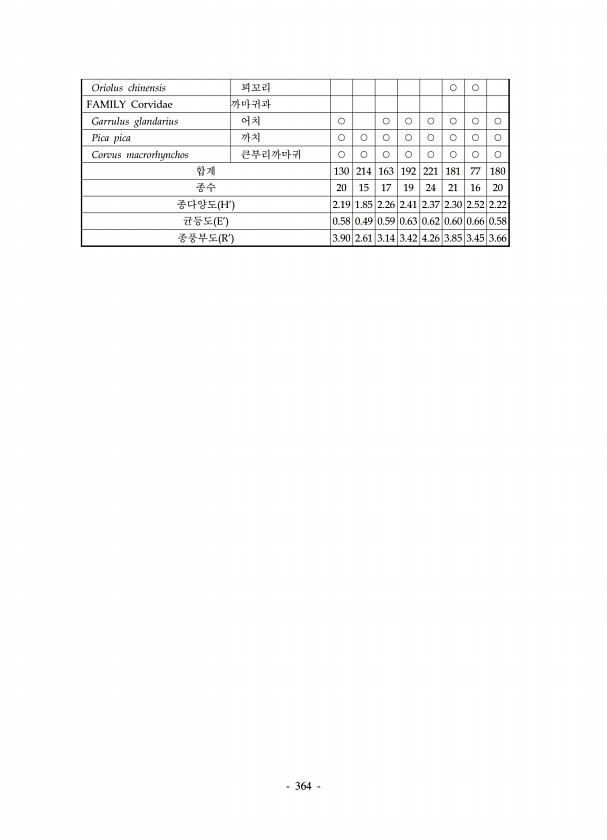 364 Oriolus chinensis 꾀꼬리 ○ ○ FAMILY Corvidae 까마귀과 Garrulus glandarius 어치 ○ ○ ○ ○ ○ ○ ○ Pica pica 까치 ○ ○ ○ ○ ○ ○ ○ ○ Corvus macrorhynchos 큰부리까마귀 ○ ○ ○ ○ ○ ○ ○ ○ 합계 130 214 163 192 221 181 77 180 종수 20 15 17 19 24 21 16 20 종다양도 H2.19 1.85 2.26 2.41 2.37 2.30 2.52 2.22 균등도 E0.58 0.49 0.59 0.63 0.62 0.60 0.66 0.58 종풍부도 R3.90 2.61 3.14 3.42 4.26 3.85 3.453.66