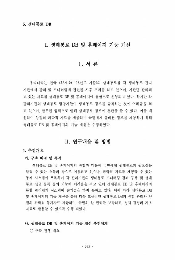 5. 생태통로 DB 1. 생태통로 DB 및 홈페이지 기능 개선 Ⅰ. 서 론 우리나라는 전국 472개소 ‘16년도 기준 의 생태통로를 각 생태통로 관리 기관에서 관리 및 모니터링에 관련된 사후 조치를 하고 있으며, 기관별 관리되 고 있는 자료를 생태통로 DB 및 홈페이지에 통합으로 운영되고 있다. 하지만 각 관리기관의 생태통로 담당자들이 생태통로 정보를 등록하는 것에 어려움을 겪 고 있으며, 잘못된 입력으로 인해 생태통로 정보에 혼란을 줄 수 있다. 이를 개 선하여 양질의 과학적 자료를 제공하며 국민에게 올바른 정보를 제공하기 위해 생태통로 DB 및 홈페이지의 기능 개선을 수행하였다. Ⅱ. 연구내용 및 방법 1. 추진개요 가. 구축 배경 및 목적 생태통로 DB 및 홈페이지의 통합과 더불어 국민에게 생태통로의 ...