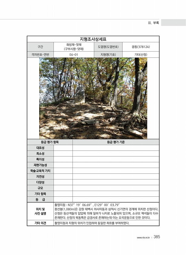 Ⅲ. 부록 www.nie.re.kr ? 385 지형조사상세표 구간 화방재댓재 구부시령댓재 도엽명 도엽번호 광동 378124 격자번호-연번 E6-01 지형명 기호 기타 산정 등급 평가 항목 등급 평가 기준 대표성 희소성 특이성 재현가능성 학술?교육적 가치 자연성 다양성 규모 기타 항목 등 급 위치 및 사진 설명 촬영지점 N37°19′06.69″, E129°00′03.79″ 환선봉 1,080m 은 강원 태백시 하사미동과 삼척시 신기면의 경계에 위치한 산정이다. 산정은 등산객들의 답압에 의해 일부가 나지로 노출되어 있으며, 소규모 핵석들이 다수 존재한다. 산정의 북동쪽은 급경사로 존재하는데 이는 요곡운동으로 인한 것이다. 기타 의견 촬영지점과 지형의 위치가 인접하여 동일한 좌표를부여하였다.