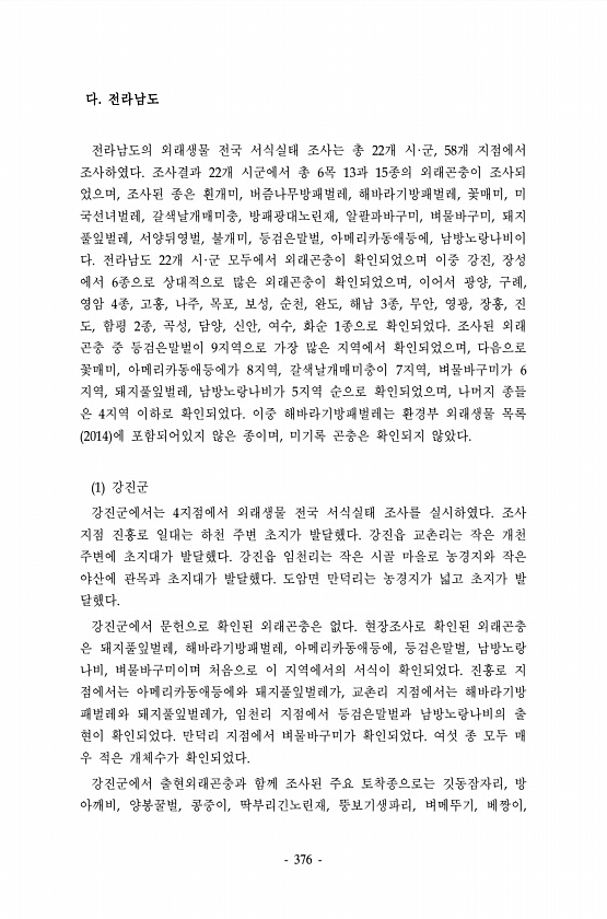 376 다. 전라남도 전라남도의 외래생물 전국 서식실태 조사는 총 22개 시·군, 58개 지점에서 조사하였다. 조사결과 22개 시군에서 총 6목 13과 15종의 외래곤충이 조사되 었으며, 조사된 종은 흰개미, 버즘나무방패벌레, 해바라기방패벌레, 꽃매미, 미 국선녀벌레, 갈색날개매미충, 방패광대노린재, 알팔파바구미, 벼물바구미, 돼지 풀잎벌레, 서양뒤영벌, 불개미, 등검은말벌, 아메리카동애등에, 남방노랑나비이 다. 전라남도 22개 시·군 모두에서 외래곤충이 확인되었으며 이중 강진, 장성 에서 6종으로 상대적으로 많은 외래곤충이 확인되었으며, 이어서 광양, 구례, 영암 4종, 고흥, 나주, 목포, 보성, 순천, 완도, 해남 3종, 무안, 영광, 장흥, 진 도, 함평 2종, 곡성, 담양, 신안, 여수, 화순 1종...