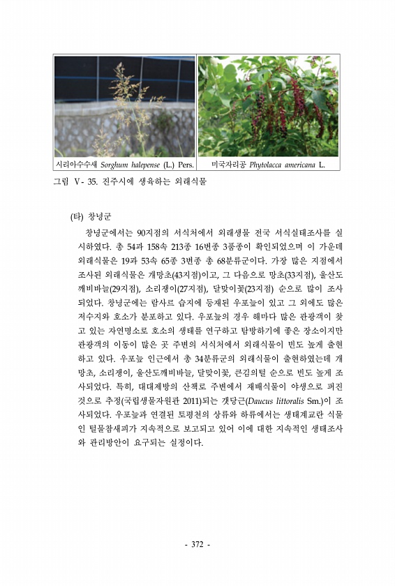 시리아수수새 Sorghum halepense L. Pers. 미국자리공 Phytolacca americana L. 그림 Ⅴ- 35. 진주시에 생육하는 외래식물 타 창녕군 창녕군에서는 90지점의 서식처에서 외래생물 전국 서식실태조사를 실 시하였다. 총 54과 158속 213종 16변종 3품종이 확인되었으며 이 가운데 외래식물은 19과 53속 65종 3변종 총 68분류군이다. 가장 많은 지점에서 조사된 외래식물은 개망초 43지점 이고, 그 다음으로 망초 33지점 , 울산도 깨비바늘 29지점 , 소리쟁이 27지점 , 달맞이꽃 23지점 순으로 많이 조사 되었다. 창녕군에는 람사르 습지에 등재된 우포늪이 있고 그 외에도 많은 저수지와 호소가 분포하고 있다. 우포늪의 경우 해마다 많은 관광객이 찾 고 있는 자연명소로 ...