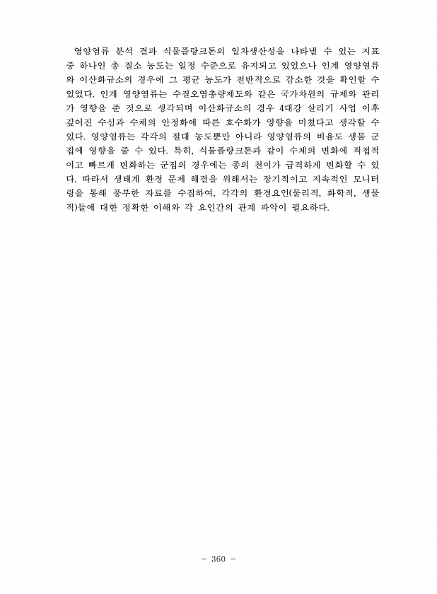 360 영양염류 분석 결과 식물플랑크톤의 일차생산성을 나타낼 수 있는 지표 중 하나인 총 질소 농도는 일정 수준으로 유지되고 있었으나 인계 영양염류 와 이산화규소의 경우에 그 평균 농도가 전반적으로 감소한 것을 확인할 수 있었다. 인계 영양염류는 수질오염총량제도와 같은 국가차원의 규제와 관리 가 영향을 준 것으로 생각되며 이산화규소의 경우 4대강 살리기 사업 이후 깊어진 수심과 수체의 안정화에 따른 호수화가 영향을 미쳤다고 생각할 수 있다. 영양염류는 각각의 절대 농도뿐만 아니라 영양염류의 비율도 생물 군 집에 영향을 줄 수 있다. 특히, 식물플랑크톤과 같이 수체의 변화에 직접적 이고 빠르게 변화하는 군집의 경우에는 종의 천이가 급격하게 변화할 수 있 다. 따라서 생태계 환경 문제 해결을 위해서는 장기적이고...