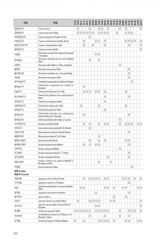 392 참방동산이 Cyperus iria L. ○ ○ ○ ○ ○ ○ ○ ○ 금방동산이 Cyperus microiria Steud. ○ ○ ○ ○ ○ ○ ○ ○ ○ ○ ○ ○ ○ ○ 푸른방동산이 Cyperus nipponicus Franch. & Sav. ○ 쇠방동산이 Cyperus orthostachyus Franch. & Sav. ○ ○ ○ ○ ○ ○ ○ ○ ○ 방동산이대가리 Cyperus sanguinolentus Vahl ○ ○ ○ ○ ○ 꽃방동산이 Cyperus serotinus Rottb. ○ 쇠털골 Eleocharis acicularis for. longiseta Svenson T. Koyama ○ ○ 참바늘골 Eleocharis attenuata for. laeviseta Nakai Hara ○...