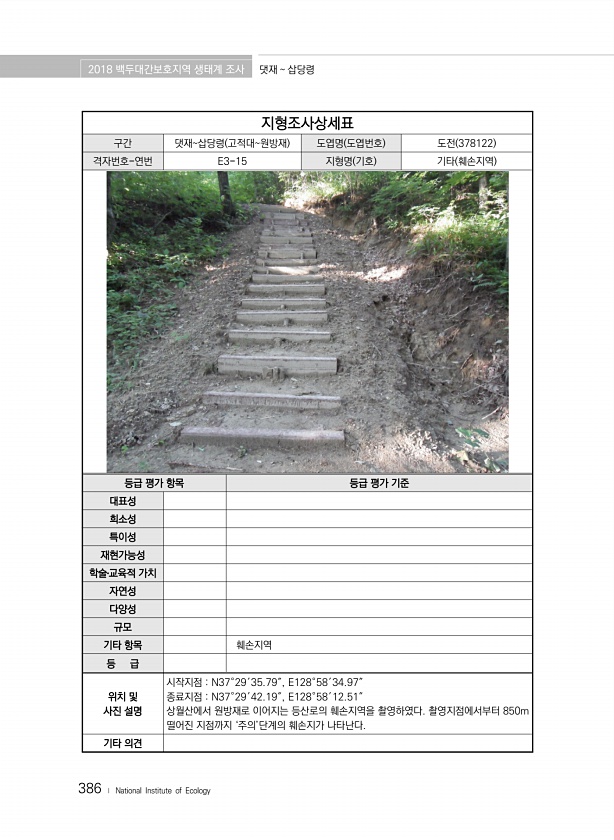 2018 백두대간보호지역 생태계 조사 댓재 삽당령 386 ? National Institute of Ecology 지형조사상세표 구간 댓재삽당령 고적대원방재 도엽명 도엽번호 도전 378122 격자번호-연번 E3-15 지형명 기호 기타 훼손지역 등급 평가 항목 등급 평가 기준 대표성 희소성 특이성 재현가능성 학술?교육적 가치 자연성 다양성 규모 기타 항목 훼손지역 등 급 위치 및 사진 설명 시작지점 N37°29′35.79″, E128°58′34.97″ 종료지점 N37°29′42.19″, E128°58′12.51″ 상월산에서 원방재로 이어지는 등산로의 훼손지역을 촬영하였다. 촬영지점에서부터 850m 떨어진 지점까지 ‘주의’단계의 훼손지가 나타난다. 기타의견