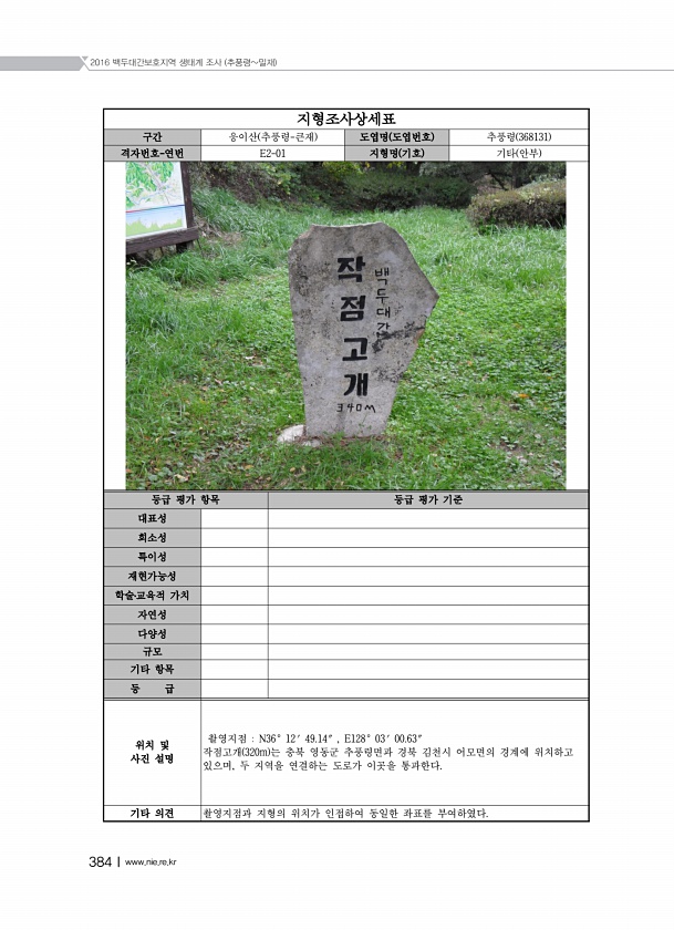 2016 백두대간보호지역 생태계 조사 추풍령밀재 384Ⅰwww.nie.re.kr 지형조사상세표 구간 웅이산 추풍령-큰재 도엽명 도엽번호 추풍령 368131 격자번호-연번 E2-01 지형명 기호 기타 안부 등급 평가 항목 등급 평가 기준 대표성 희소성 특이성 재현가능성 학술?교육적 가치 자연성 다양성 규모 기타 항목 등 급 위치 및 사진 설명 촬영지점 N36° 12′ 49.14″ , E128° 03′ 00.63″ 작점고개 320m 는 충북 영동군 추풍령면과 경북 김천시 어모면의 경계에 위치하고 있으며, 두 지역을 연결하는 도로가 이곳을 통과한다. 기타 의견 촬영지점과 지형의 위치가 인접하여 동일한 좌표를부여하였다.