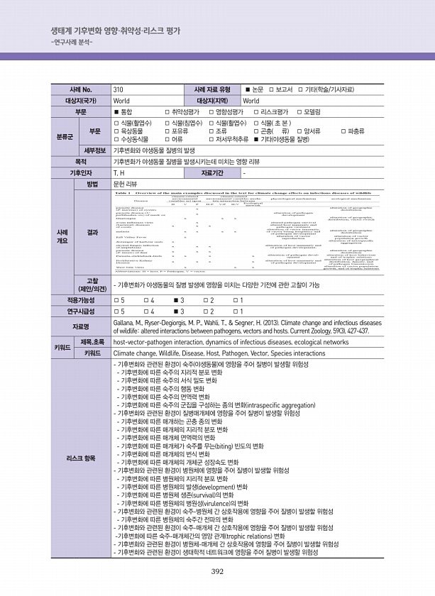 392 생태계 기후변화 영향·취약성·리스크 평가 -연구사례 분석- 사례 No. 310 사례 자료 유형 ■ 논문 □ 보고서 □ 기타 학술/기사자료 대상지 국가 World 대상지 지역 World 부문 ■ 통합 □ 취약성평가 □ 영향성평가 □ 리스크평가 □ 모델링 분류군 부문 □ 식물 활엽수 □ 식물 침엽수 □ 식물 활엽수 □ 식물 초 본 □ 육상동물 □ 포유류 □ 조류 □ 곤충 류 □ 양서류 □ 파충류 □ 수상동식물 □ 어류 □ 저서무척추류 ■ 기타 야생동물 질병 세부정보 기후변화와 야생동물 질병의 발생 목적 기후변화가 야생동물 질병을 발생시키는데 미치는 영향 리뷰 기후인자 T, H 자료기간 사례 개요 방법 문헌 리뷰 결과 고찰 제안/의견 기후변화가 야생동물의 질병 발생에 영향을 미치는 다양한 기전에 관한 고찰...