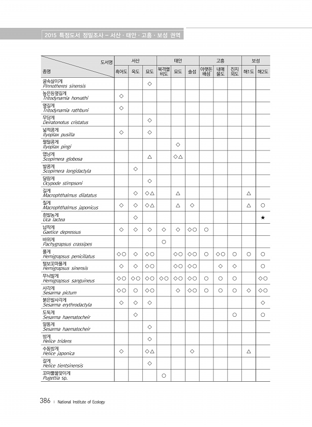 2015 특정도서 정밀조사 서산·태안·고흥·보성 권역 386 ? National Institute of Ecology 도서명 종명 서산 태안 고흥 보성 흑어도 옥도 묘도 북격렬 비도 묘도 솔섬 아랫돈 배섬 내매 물도 진지 외도 해1도 해2도 굴속살이게 Pinnotheres sinensis ◇ 높은등옆길게 Tritodynamia horvathi ◇ 옆길게 Tritodynamia rathbuni ◇ 무당게 Deiratonotus cristatus ◇ 넓적콩게 Ilyoplax pusilla ◇ ◇ 펄털콩게 Ilyoplax pingi ◇ 엽낭게 Scopimera globosa △ ◇ △ 발콩게 Scopimera longidactyla ◇ 달랑게 Ocypode stimpsoni ◇ 길게 Macrophthalmus d...