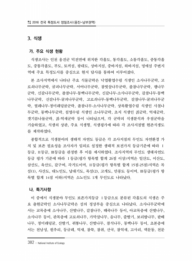2016 전국 특정도서 정밀조사 옹진-남부권역 382 ? National Institute of Ecology 3. 식생 가. 주요 식생 현황 식생조사는 인천 옹진군 덕전면에 위치한 각흘도, 통각흘도, 소통각흘도, 중통각흘 도, 중통각흘도, 부도, 토끼섬, 광대도, 상바지섬, 중바지섬, 하바지섬, 멍애섬 주변지 역에 주요 특정도서를 중심으로 현지 답사를 통하여 이루어졌다. 본 조사지역에서 나타난 주요 식물군락은 낙엽활엽수림 식생인 소사나무군락, 고 로쇠나무군락, 굴피나무군락, 서어나무군락, 참빗살나무군락, 졸참나무군락, 팽나무 군락, 신갈나무군락, 졸참나무-동백나무군락, 신갈나무-소사나무군락, 갈참나무-동백 나무군락, 신갈나무-굴피나무군락, 고로쇠나무-동백나무군락, 갈참나무-굴피나무군 락, 찔레나무-청미래덩...