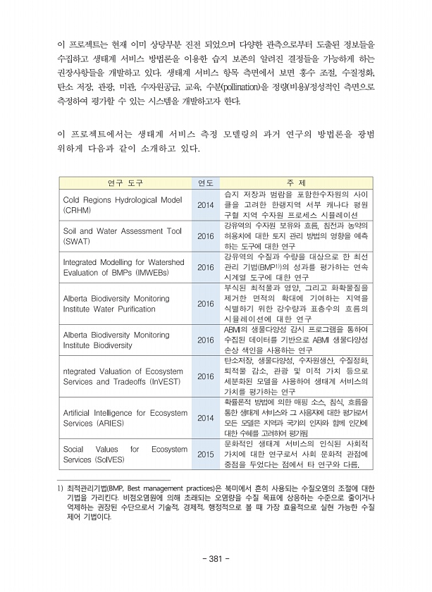 이 프로젝트는 현재 이미 상당부분 진전 되었으며 다양한 관측으로부터 도출된 정보들을 수집하고 생태계 서비스 방법론을 이용한 습지 보존의 알려진 결정들을 가능하게 하는 권장사항들을 개발하고 있다. 생태계 서비스 항목 측면에서 보면 홍수 조절, 수질정화, 탄소 저장, 관광, 미관, 수자원공급, 교육, 수분 pollination 을 정량 비용 /정성적인 측면으로 측정하여 평가할 수 있는 시스템을 개발하고자 한다. 이 프로젝트에서는 생태계 서비스 측정 모델링의 과거 연구의 방법론을 광범 위하게 다음과 같이 소개하고 있다. 1 최적관리기법 BMP, Best management practices 은 북미에서 흔히 사용되는 수질오염의 조절에 대한 기법을 가리킨다. 비점오염원에 의해 초래되는 오염량을 수질 목표에 상응하는...