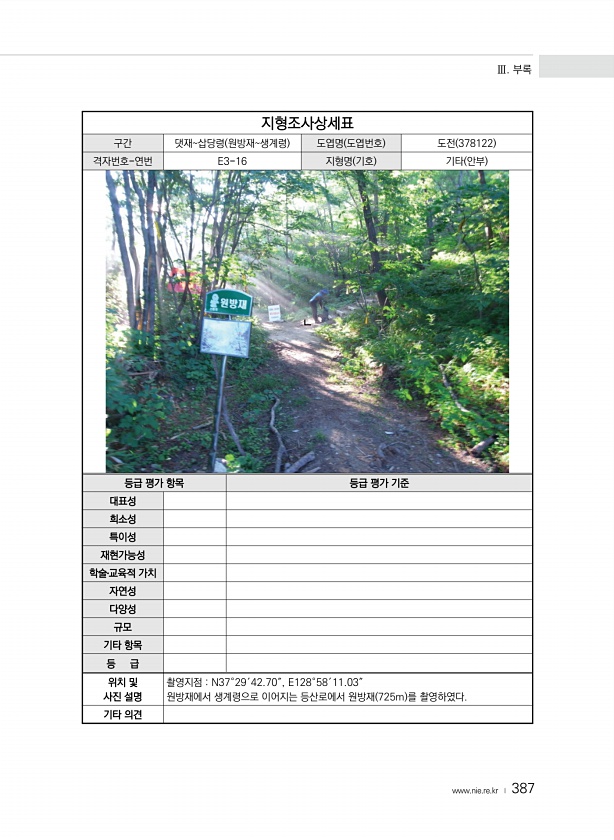 Ⅲ. 부록 www.nie.re.kr ? 387 지형조사상세표 구간 댓재삽당령 원방재생계령 도엽명 도엽번호 도전 378122 격자번호-연번 E3-16 지형명 기호 기타 안부 ㄴ 등급 평가 항목 등급 평가 기준 대표성 희소성 특이성 재현가능성 학술?교육적 가치 자연성 다양성 규모 기타 항목 등 급 위치 및 사진 설명 촬영지점 N37°29′42.70″, E128°58′11.03″ 원방재에서 생계령으로 이어지는 등산로에서 원방재 725m 를 촬영하였다. 기타의견