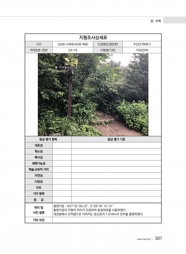 Ⅲ. 부록 www.nie.re.kr ? 387 지형조사상세표 구간 삽당령신배령 대관령매봉 도엽명 도엽번호 구산 378081 격자번호-연번 E4-16 지형명 기호 기타 안부 등급 평가 항목 등급 평가 기준 대표성 희소성 특이성 재현가능성 학술?교육적 가치 자연성 다양성 규모 기타 항목 등 급 위치 및 사진 설명 촬영지점 N37°42′09.22″, E128°45′15.13″ 촬영지점과 지형의 위치가 인접하여 동일좌표를 사용하였다. 대관령에서 선자령으로 이어지는 등산로의 1,019m의 안부를 촬영하였다. 기타의견