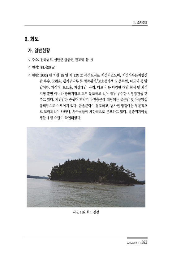 II. 조사결과 www.nie.re.kr ?383 9. ? 주소전라남도 신안군 팔금면 진고리 산 15 ? 면적33,400 ㎡ ? 현황2003 년 7 월 18 일 제 129 호 특정도서로 지정되었으며, 지정사유는지형경 관 우수, 고란초, 왕자귀나무 등 멸종위기/보호종자생 및 풍하혈, 타포니 등 발 달이다. 파식대, 포트홀, 자갈해안, 사취, 타포니 등 다양한 해안 침식 및 퇴적 지형 뿐만 아니라 풍화지형도 고루 분포하고 있어 매우 우수한 지형경관을 갖 추고 있다. 기반암은 중생대 백악기 유천층군에 해당되는 유문암 및 유문암질 응회암으로 이루어져 있다. 곰솔군락이 분포하고, 남사면 방향에는 부분적으 로 모래퇴적이 나타나, 사구식물이 제한적으로 분포하고 있다. 멸종위기야생 생물 Ⅰ급 수달이 확인되었다. 사진 41...