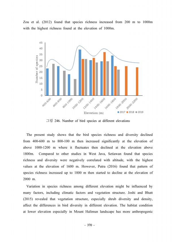 370 Zou et al. 2012 found that species richness increased from 200 m to 1000m with the highest richness found at the elevation of 1000m. 246. Number of bird species at different elevations The present study shows that the bird species richness and diversity declined from 400-600 m to 800-100 m then increased significantly at the elevation of above 1000-1200 m where it fluctuates then declined at t...