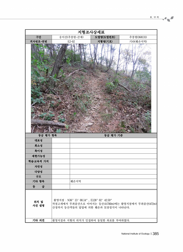 Ⅲ. 부 록 National Institute of EcologyⅠ385 지형조사상세표 구간 웅이산 추풍령-큰재 도엽명 도엽번호 추풍령 368131 격자번호-연번 E2-02 지형명 기호 기타 훼손지역 등급 평가 항목 등급 평가 기준 대표성 희소성 특이성 재현가능성 학술?교육적 가치 자연성 다양성 규모 기타 항목 훼손지역 등 급 위치 및 사진 설명 촬영지점 N36° 13′ 00.14″ , E128° 02′ 42.59″ 작점고개에서 무좌골산으로 이어지는 등산로 780m 에는 촬영지점에서 무좌골산 472m 산정까지 등산객들의 답압에 의한 훼손과 토양침식이 나타난다. 기타 의견 촬영지점과 지형의 위치가 인접하여 동일한 좌표를부여하였다.