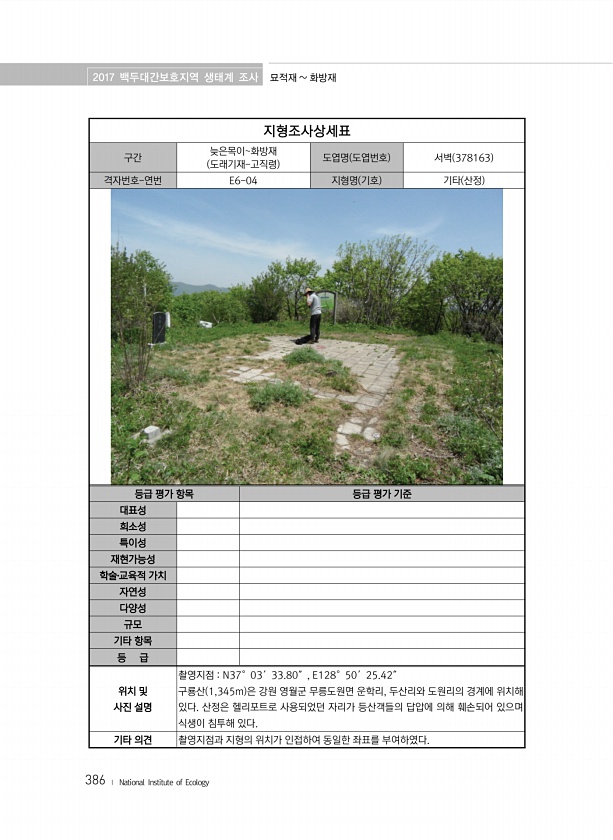 2017 백두대간보호지역 생태계 조사 묘적재 화방재 386 ? National Institute of Ecology 지형조사상세표 구간 늦은목이화방재 도래기재-고직령 도엽명 도엽번호 서벽 378163 격자번호-연번 E6-04 지형명 기호 기타 산정 등급 평가 항목 등급 평가 기준 대표성 희소성 특이성 재현가능성 학술?교육적 가치 자연성 다양성 규모 기타 항목 등 급 위치 및 사진 설명 촬영지점 N37°03′33.80″, E128°50′25.42″ 구룡산 1,345m 은 강원 영월군 무릉도원면 운학리, 두산리와 도원리의 경계에 위치해 있다. 산정은 헬리포트로 사용되었던 자리가 등산객들의 답압에 의해 훼손되어 있으며 식생이 침투해 있다. 기타 의견 촬영지점과 지형의 위치가 인접하여 동일한 좌표를부여하였다.
