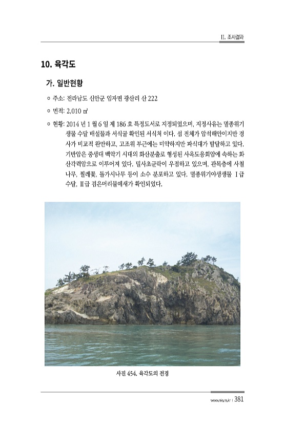 II. 조사결과 www.nie.re.kr ?381 10. ? 주소전라남도 신안군 임자면 광산리 산 222 ? 면적2,010 ㎡ ? 현황2014 년 1 월 6 일 제 186 호 특정도서로 지정되었으며, 지정사유는 멸종위기 생물 수달 배설물과 서식굴 확인된 서식처 이다. 섬 전체가 암석해안이지만 경 사가 비교적 완만하고, 고조위 부근에는 미약하지만 파식대가 발달하고 있다. 기반암은 중생대 백악기 시대의 화산분출로 형성된 사옥도응회암에 속하는 화 산각력암으로 이루어져 있다. 밀사초군락이 우점하고 있으며, 관목층에 사철 나무, 찔레꽃, 돌가시나무 등이 소수 분포하고 있다. 멸종위기야생생물 Ⅰ급 수달, Ⅱ급 검은머리물떼새가 확인되었다. 사진 454. 육각도의전경