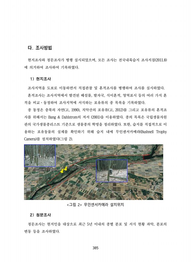385 다. 조사방법 현지조사와 청문조사가 병행 실시되었으며, 모든 조사는 전국내륙습지 조사지침 2011.8 에 의거하여 조사하여 기록하였다. 1 현지조사 조사지역을 도보로 이동하면서 직접관찰 및 흔적조사를 병행하여 조사를 실시하였다. 흔적조사는 조사지역에서 발견된 배설물, 발자국, 식이흔적, 영역표시 등의 여러 가지 흔 적을 비교·동정하여 조사지역에 서식하는 포유류의 종 목록을 기록하였다. 종 동정은 충북의 자연 고, 1990 , 치악산의 포유류 고, 2012 를 그리고 포유류의 흔적조 사를 위해서는 Bang & Dahlstrom의 저서 2001 을 이용하였다. 종의 목록은 국립생물자원 관의 국가생물종리스트 기준으로 생물종의 학명을 정리하였다. 또한, 습지를 직접적으로 이 용하는 포유동물의 실체를 확인하기...